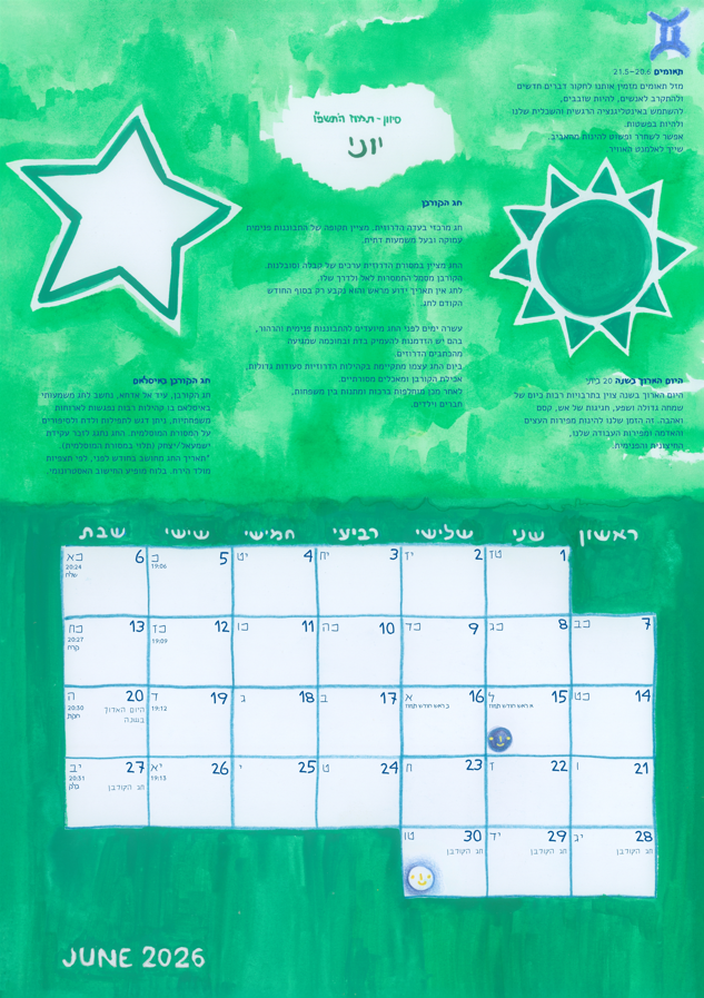 לוח שנה פיזי, תלוי על הקיר (או כל מקום אחר שתרצו לתלות אותו) עם איורים ועיצוב מיוחד בסגנון משתנה בין חודש לחודש, בהתאם לאופיו והחגים הנחגגים בו.